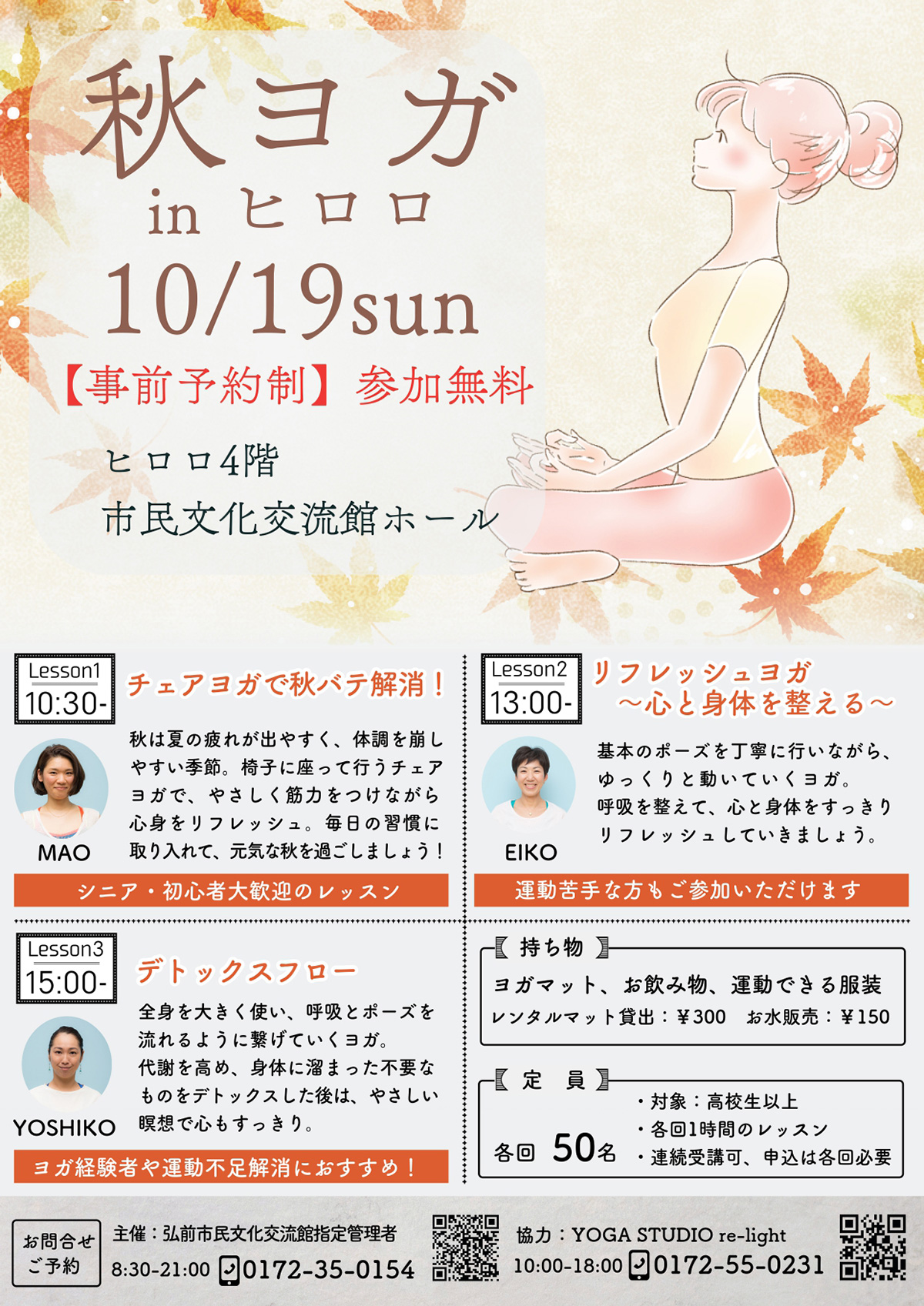 | 申込方法 | お申込み先 ・弘前市民文化交流館 TEL:0172-35-0154(8:30~21:00) ・YOGA STUDIO re-light TEL:0172-55-0231(10:00~18:00) 窓口・お電話にてお申込受付いたします。 ※連続受講可能ですが、お申込は各回ごとにお願いします。 |