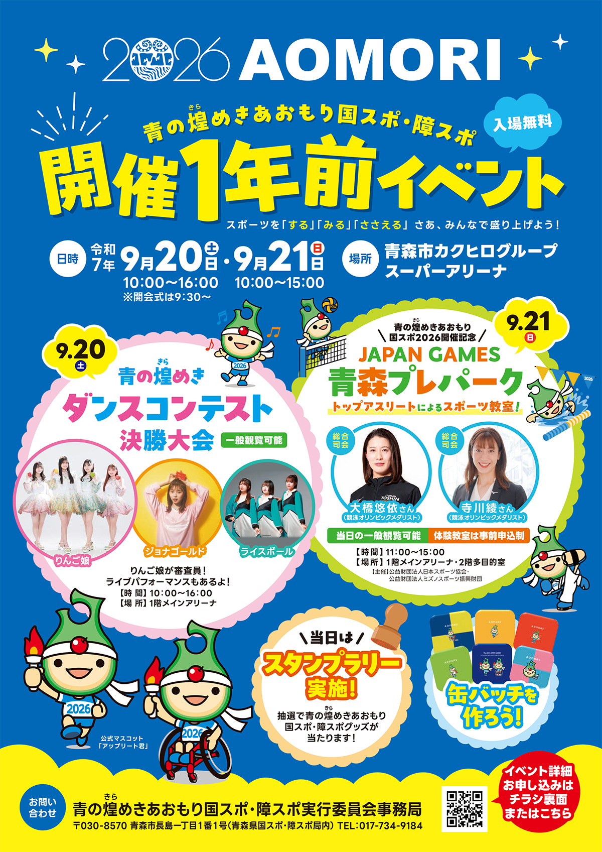 | お問い合わせ | 青の煌めきあおもり国スポ・障スポ実行委員会事務局 〒030-8570 青森市長島一丁目1番1号(青森県国スポ・障スポ局内) TEL:017-734-9184 |