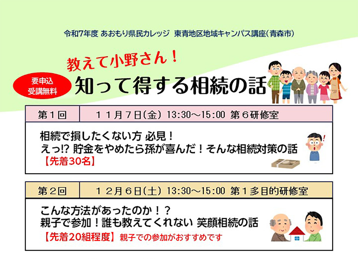あおもり県民カレッジ講座 教えて小野さん!知って得する相続の話【11月7日】