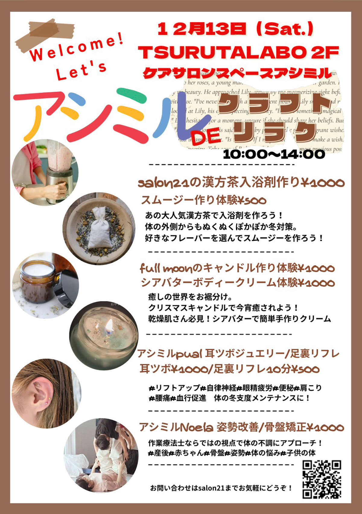 | 料金 | 漢方茶入り入浴剤作り体験¥1000 スムージー作り体験¥500 キャンドル作り体験¥1000 シアバターボディークリーム作り¥1000 耳ツボジュエリー¥1000 足裏リフレ10分¥500 姿勢改善/骨盤矯正¥1000 |