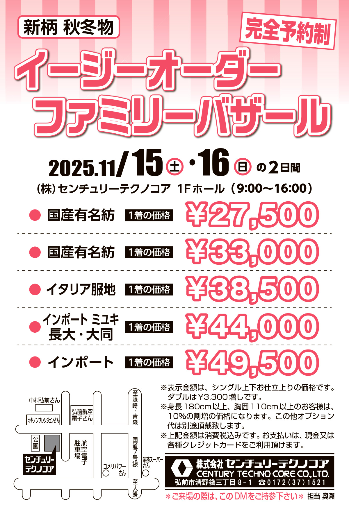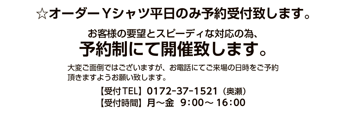 | 予約方法 | 大変ご面倒ではございますがお電話にてご来場の日時をご予約頂きますようお願い致します。 ☆オーダーYシャツ平日のみ予約受付致します。 【受付TEL】0172-37-1521(奥瀬) 【受付時間】月~金 9:00~16:00 |