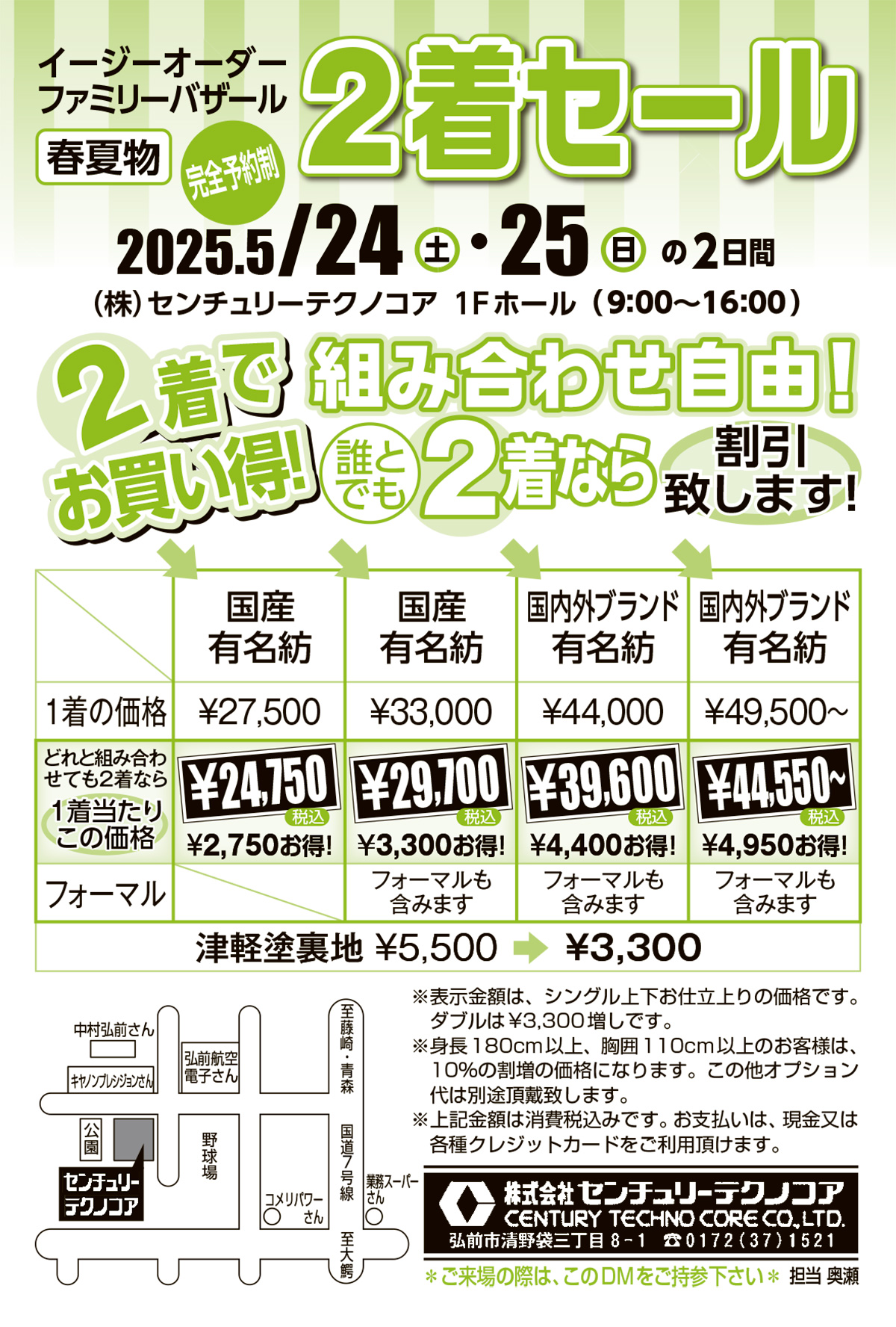 | 内容 | ※表示金額は、シングル上下お仕立上りの価格です。 ダブルは¥3,300増しです。 ※身長180cm以上、胸囲110cm以上のお客様は、10%の割増の価格になります。この他オプション代は別途頂戴致します。 ※上記金額は消費税込みです。お支払いは、現金又は各種クレジットカードをご利用頂けます。 ※大変ご面倒ではございますがお電話にてご来場の日時をご予約頂きますようお願い致します。 【受付TEL】0172-37-1521 【受付時間】月~土 9:00~16:00 |