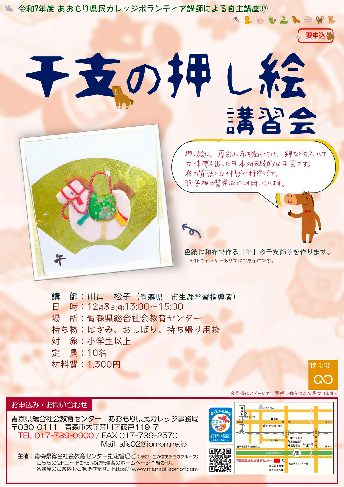 | 申込・お問い合わせ | 青森県総合社会教育センター あおもり県民カレッジ事務局 〒030-0111 青森市大字荒川字藤戸119-7 TEL 017-739-0900 FAX 017-739-2570 メール alis02@jomon.ne.jp |