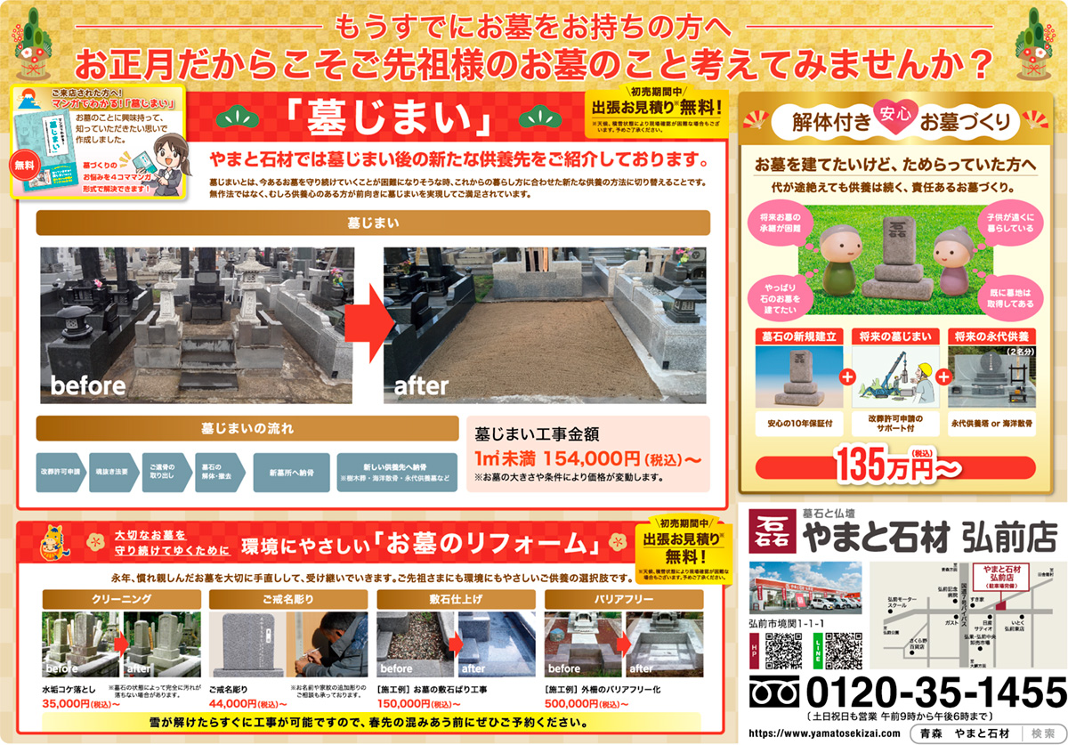 やまと石材では、日頃の感謝を込めて新春初売りを開催しております。 期間中は、初売り限定価格の墓石を多数展示!さらに、この時期だけの【えらべる成約特典】や【ご来店・お見積り特典】もご用意しております。