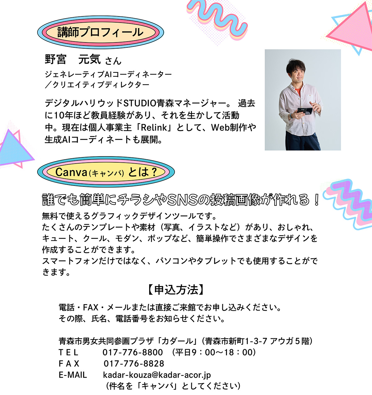 | 主催・お問い合わせ・申込み | 主催:青森市男女共同参画プラザ「カダール」(指定管理者:NPO法人あおもり男女共同参画をすすめる会) 〒030-0801 青森市新町1-3-7 アウガ5階 電話・FAX・メールまたは直接ご来館ください。 お申し込みの際は下記の必要事項をお知らせください。 ・名前 ・電話番号 TEL:017-776-8800(平日9:00~18:00) FAX:017ー776ー8828 E-MAIL:kadar-kouza@kadar-acor.jp (件名を「キャンバ」とし、上記必要事項をお知らせください) |
