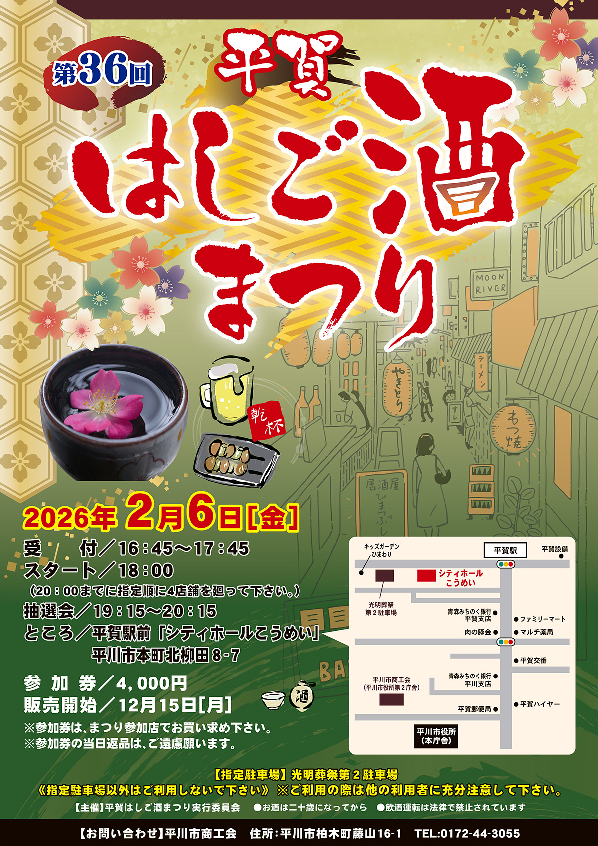 | お問い合わせ | 平賀はしご酒まつり実行委員会 事務局 (平川市商工会内) TEL 0172-44-3055 |
