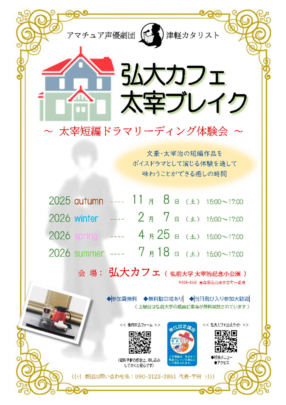 文豪・太宰治が学生時代を過ごしたキャンパスの片隅に佇む喫茶室で、太宰短編をテキストにして「声劇」体験してみませんか。成田専蔵珈琲店の喫茶メニューを嗜みながら、非日常のドキドキと、癒しの時間をいっしょに過ごしましょう。参加費無料です。