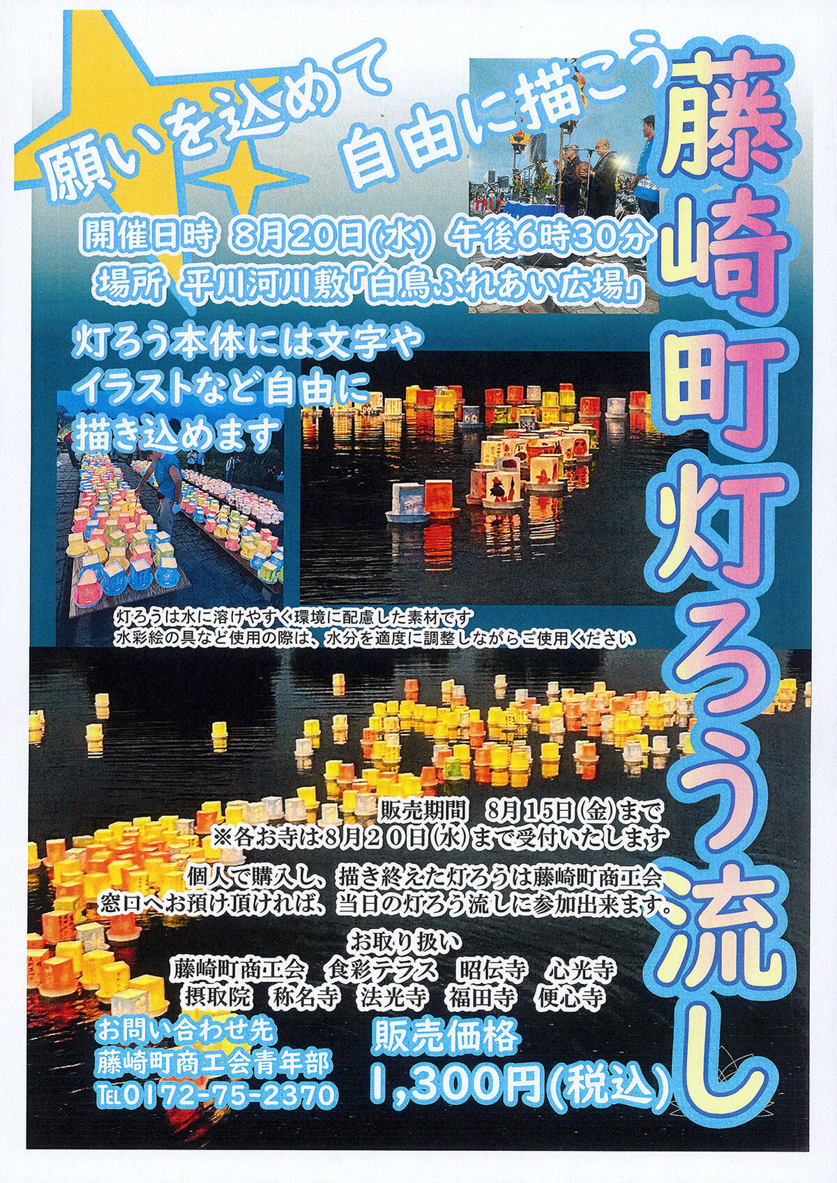 個人で購入し、描き終えた灯ろうは藤崎町商工会窓口へお預け頂ければ、当日の灯ろう流しに参加出来ます。