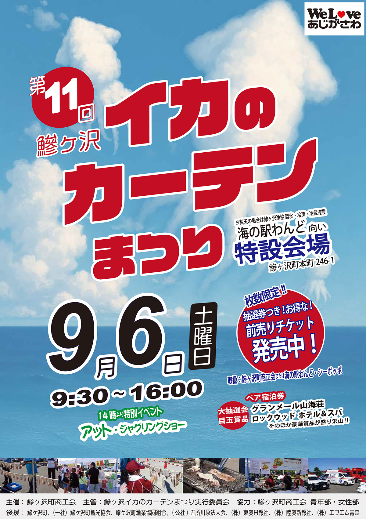 イカ引換券と抽選券が付いたお得な前売りチケットは、鯵ヶ沢町商工会と海の駅わんど内シーポッポにて発売中!