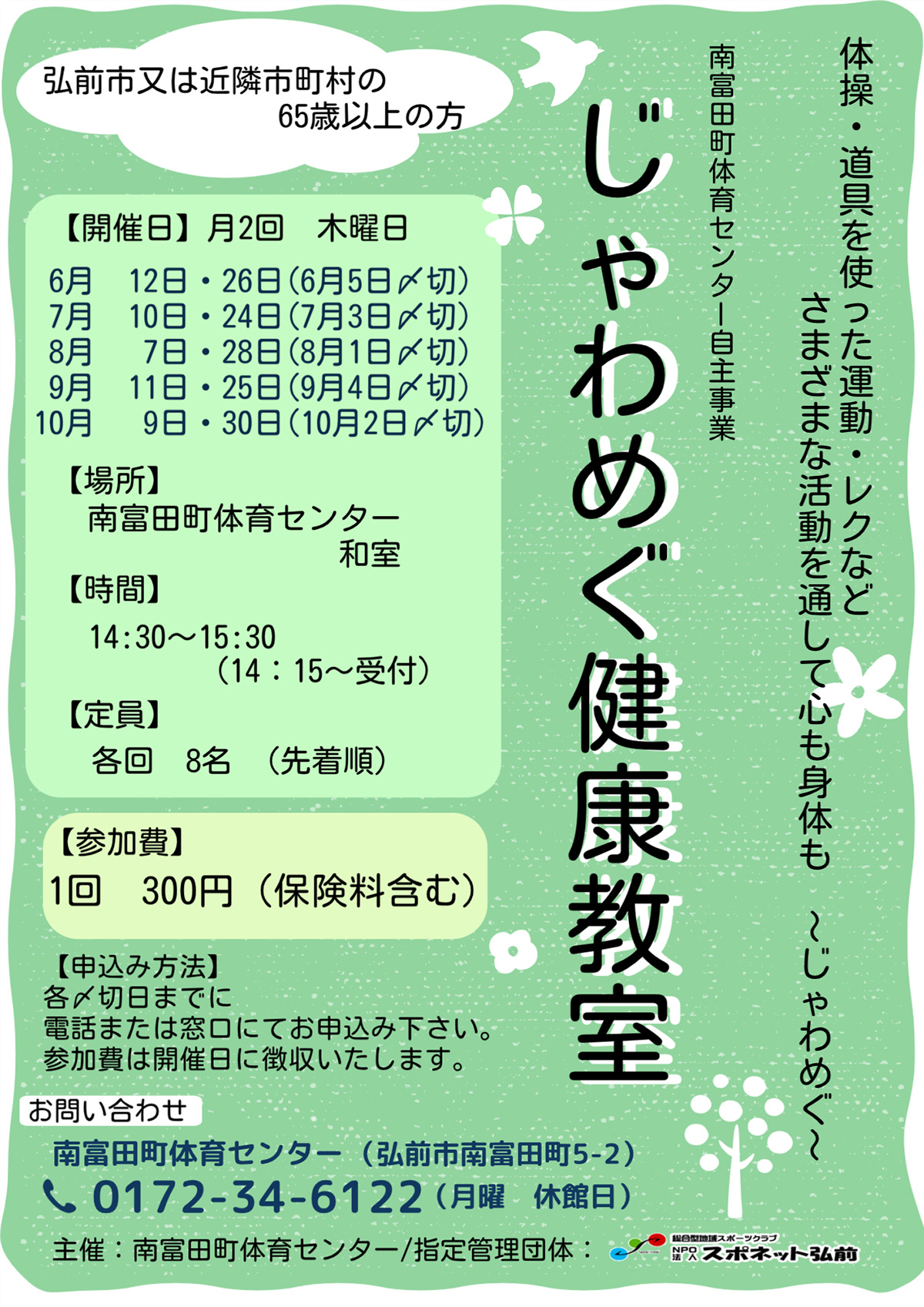 | 対象 | 弘前市又は近隣市町村の65歳以上の方 各回8名(先着順) |
