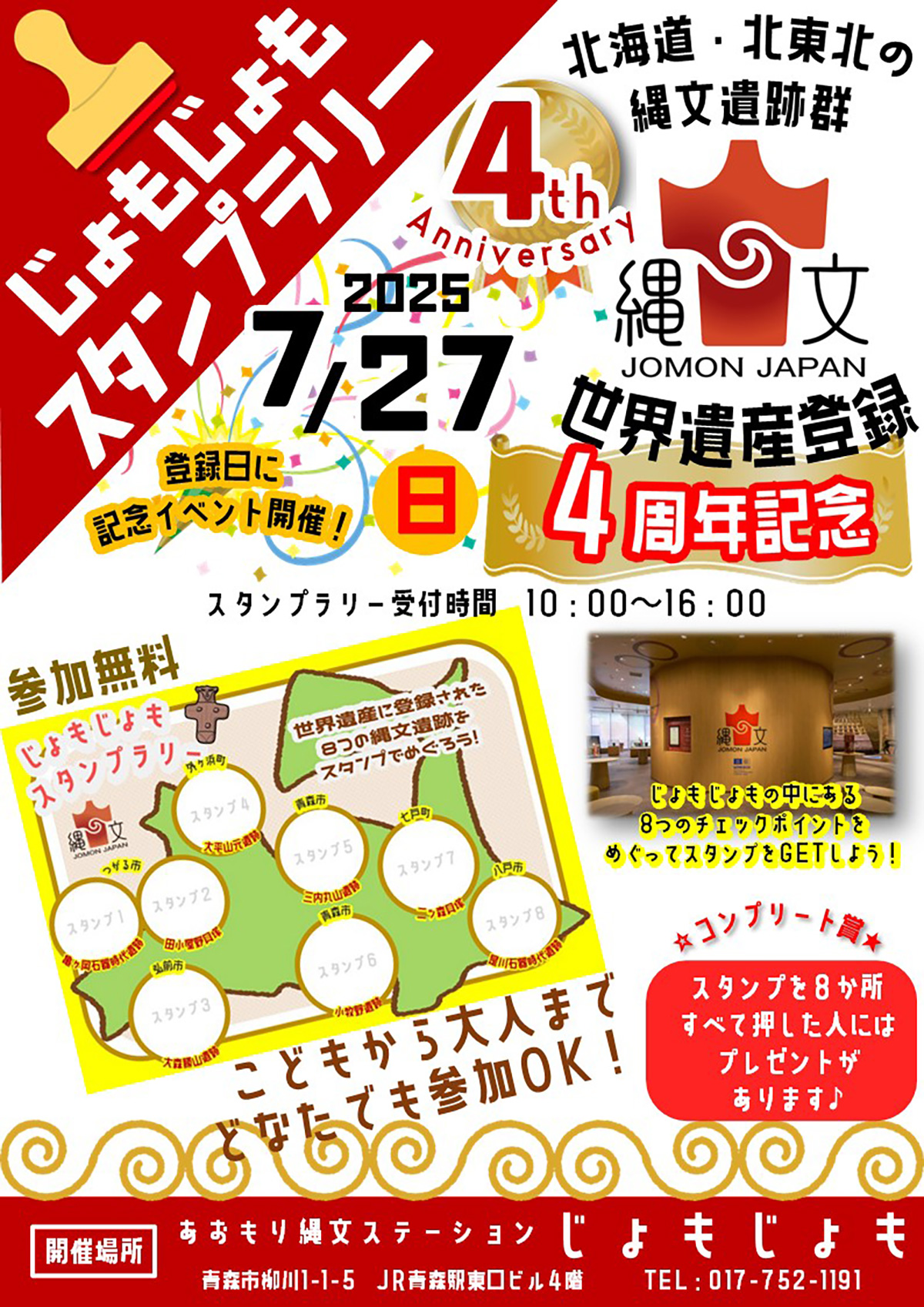 世界遺産「北海道・北東北の縄文遺跡群」の世界遺産登録4周年を記念して、スタンプラリーを開催します!じょもじょもの中に世界遺産に登録された県内8つの縄文遺跡のスタンプをご用意。スタンプ台紙に8ヶ所すべてのスタンプを押した方には、コンプリート賞としてプレゼントがあります!子どもから大人までどなたでも楽しめるイベントです!ぜひご参加ください!