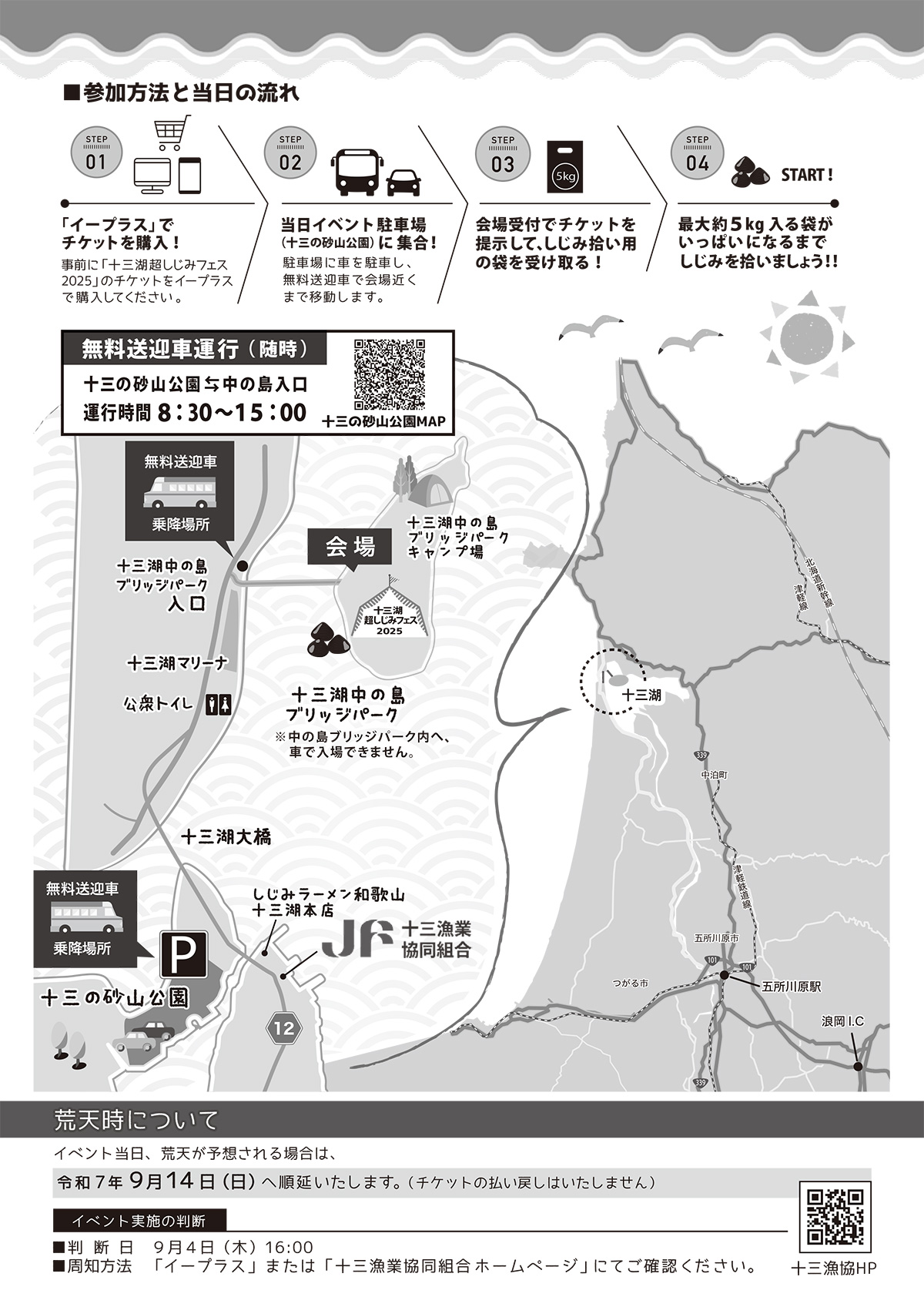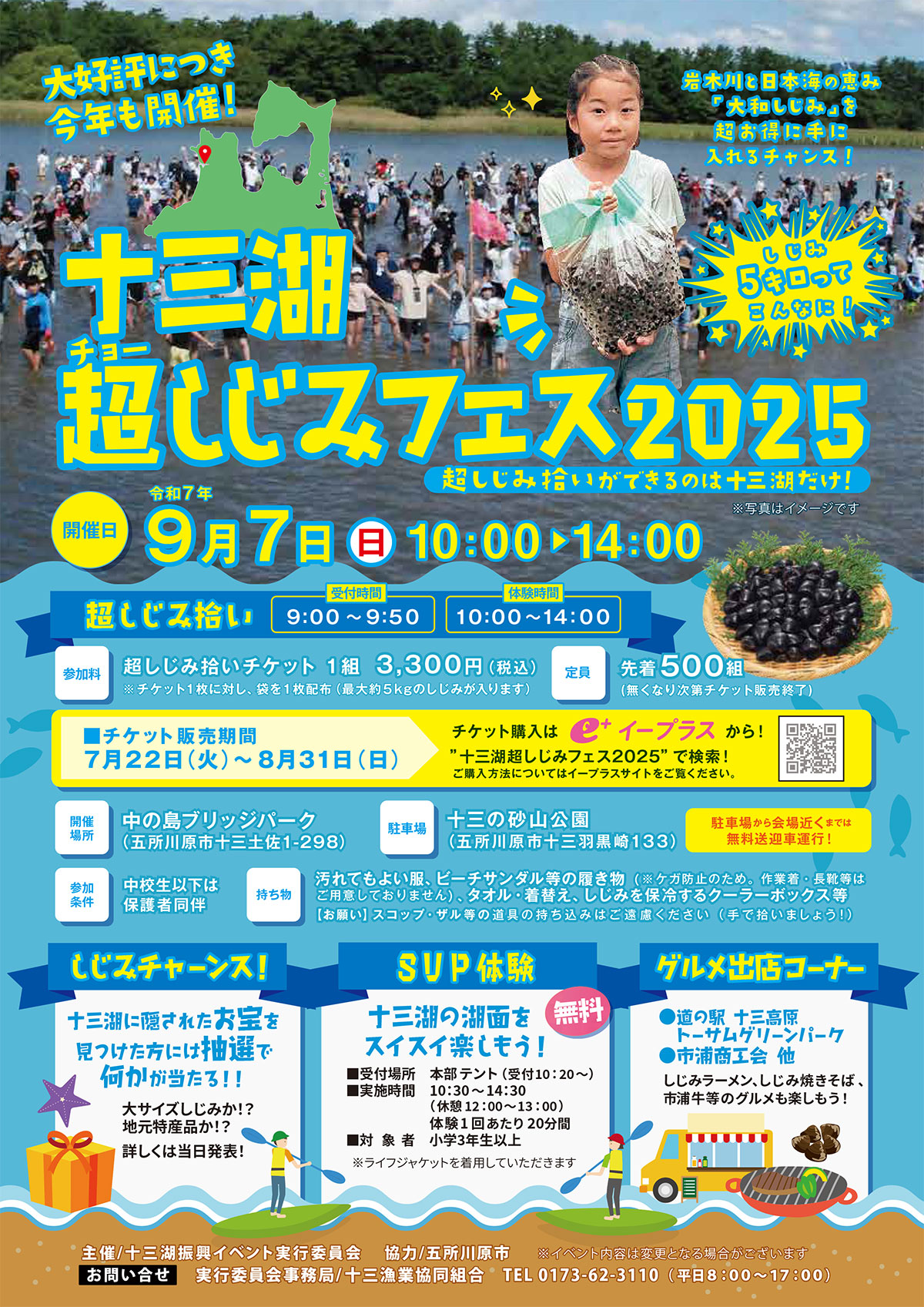 | お問い合わせ | 実行委員会事務局/十三漁業協同組合 TEL 0173-62-3110 (平日8:00~17:00) |