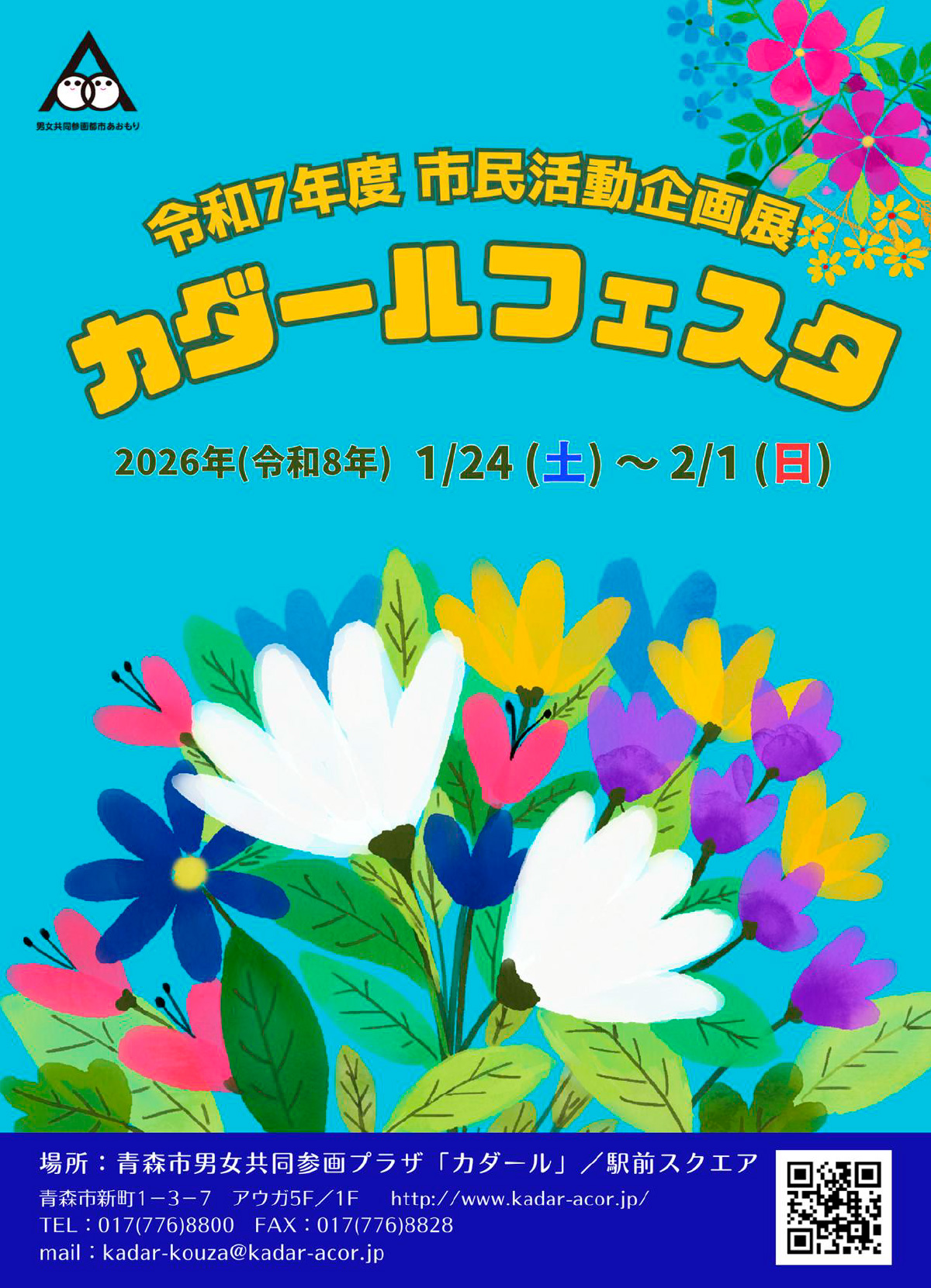 | お問い合わせ | 青森市男女共同参画プラザ「カダール」 (指定管理者:NPO法人あおもり男女共同参画をすすめる会) 〒030-0801 青森市新町1-3-7 アウガ5階 TEL:017-776-8800(平日9:00~18:00) FAX:017ー776ー8828 E-MAIL:kadar-kouza@kadar-acor.jp |