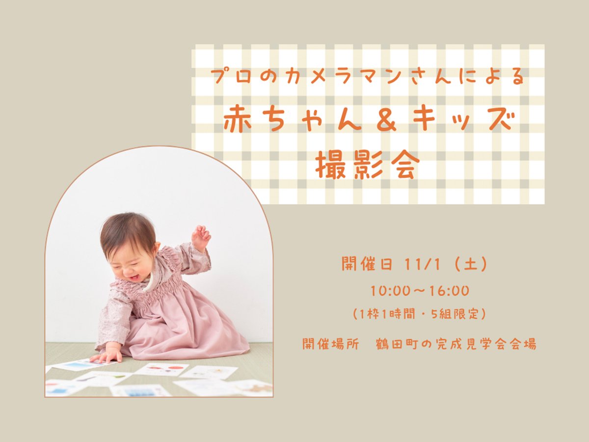 鶴田町にある平屋の完成見学会会場をスタジオにして、プロのカメラマンさんがお子さんの今を写真に残します!年賀状の作成用データとしても◎
