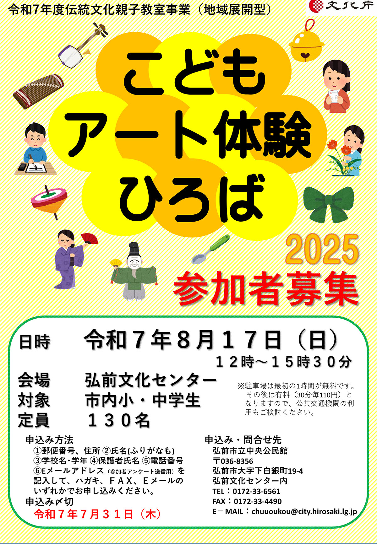 | 申込・お問い合わせ | 弘前市立中央公民館 〒036-8356 弘前市下白銀町19-4 弘前文化センター内 TEL:0172-33-6561 FAX:0172-33-4490 E-MAIL:chuuoukou@city.hirosaki.lg.jp |