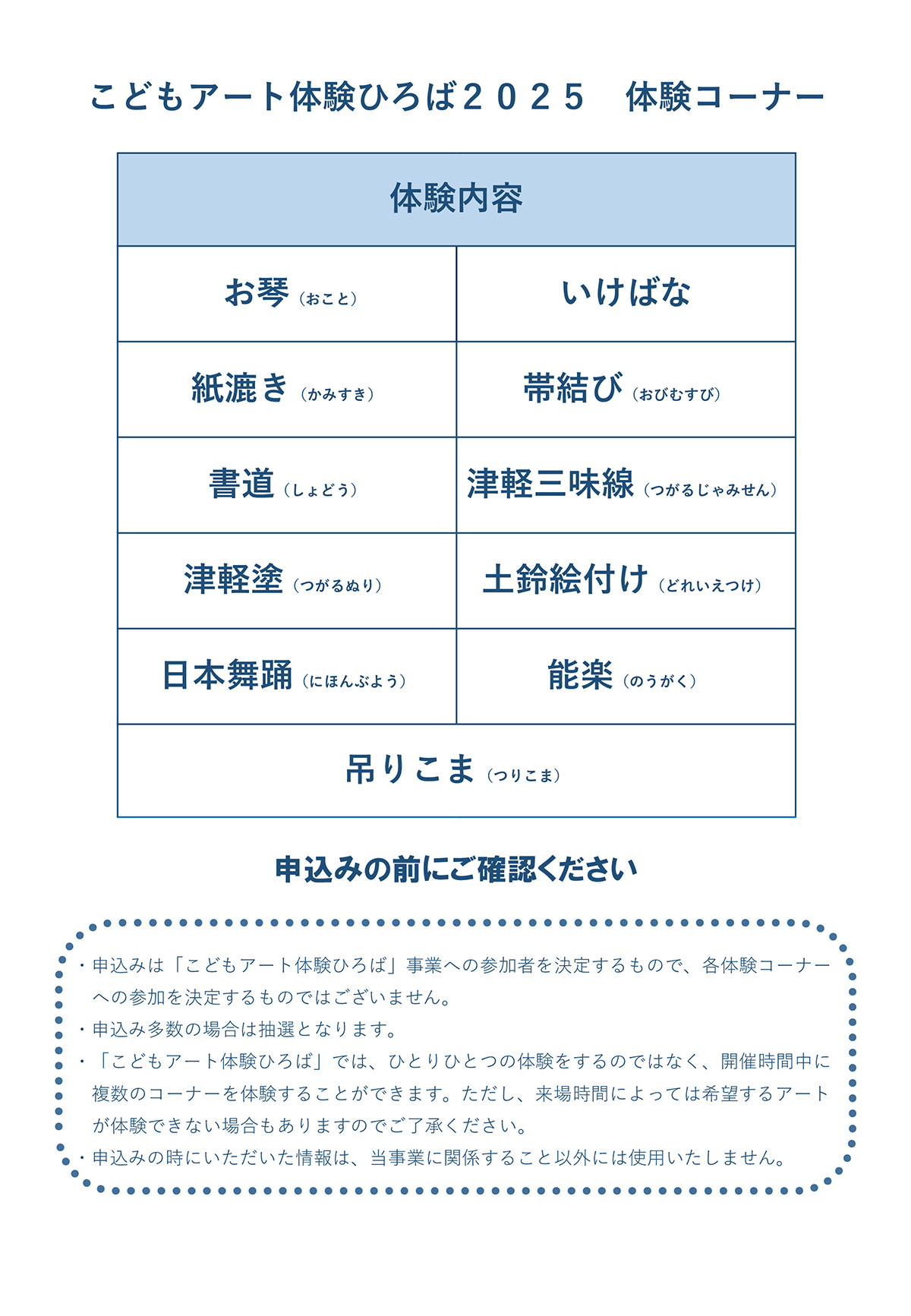 | その他 | ※申込みは「こどもアート体験ひろば」事業への参加者を決定するもので、各体験コーナーへの参加を決定するものではございません。 ※応募者多数の場合は抽選となります。 ※参加可否については後日ご案内します。 |