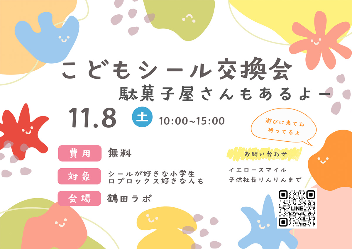 今流行りのシール交換会で子ども達の交流を増やそう!!駄菓子屋もあります!お菓子交換も楽しめます!お気に入りのシールが見つかるといいね!他にも沢山の出店者さんが沢山きますよ!