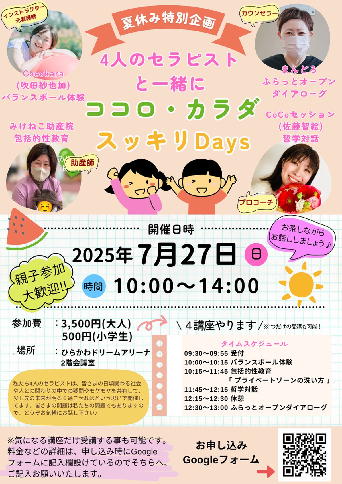 このイベントは、4人のセラピスト(助産師・公認心理師・プロコーチ・元看護士バランスボールインストラクター)と共に、様々な視点で知る・深める・繋がる・リフレッシュするを体験します。