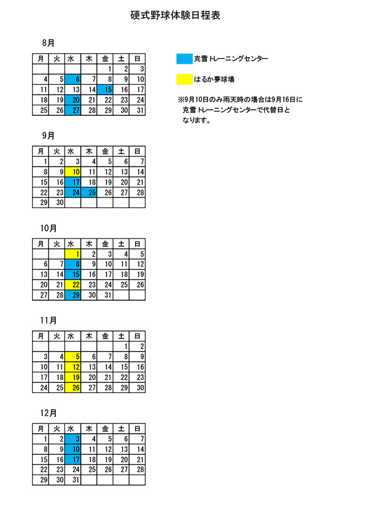| 持ち物 | ユニフォーム・帽子・スパイク・グローブ(軟式可) 飲み物・タオルなど |