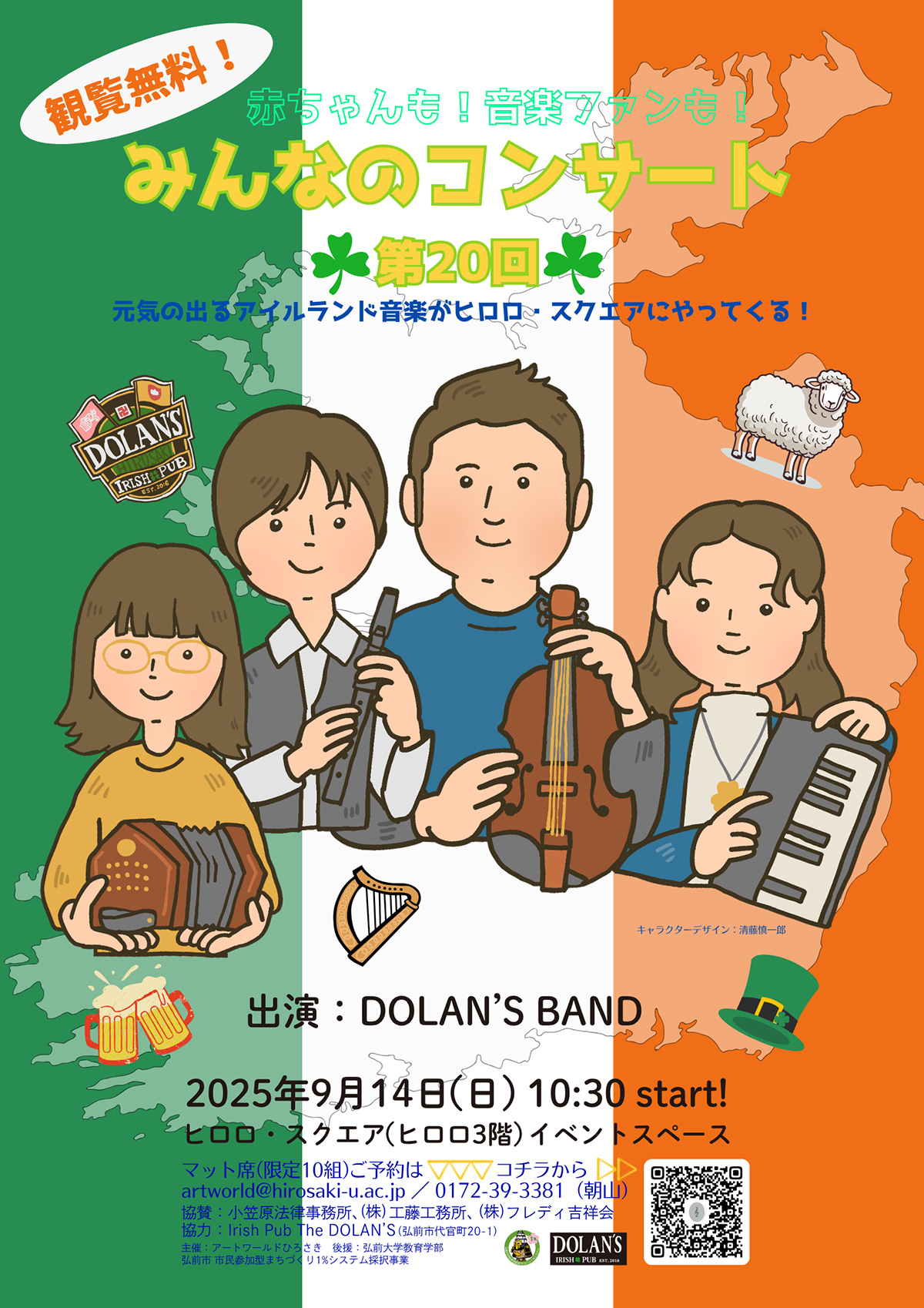 アイルランドの伝統音楽が、アイリッシュ・パブ「DOLAN'S(ドーランズ)」をとびだして、休日午前中のヒロロ・スクエアにやってきます。出演はその名も「DOLAN'S BAND(ドーランズ・バンド)」、コンサーティーナ(アコーディオンの一種)、ティンホイッスル(リコーダーの一種)、フィドル(ヴァイオリンの一種)とキーボードの四人のメンバーで演奏します。ご家族みんなで、元気の出るセッションをお楽しみ下さい。
