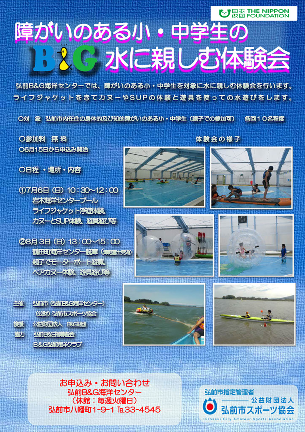 | お問い合わせ | 弘前B&G海洋センター(毎週火曜日休館) 弘前市八幡町1-9-1 電話:33-4545 |