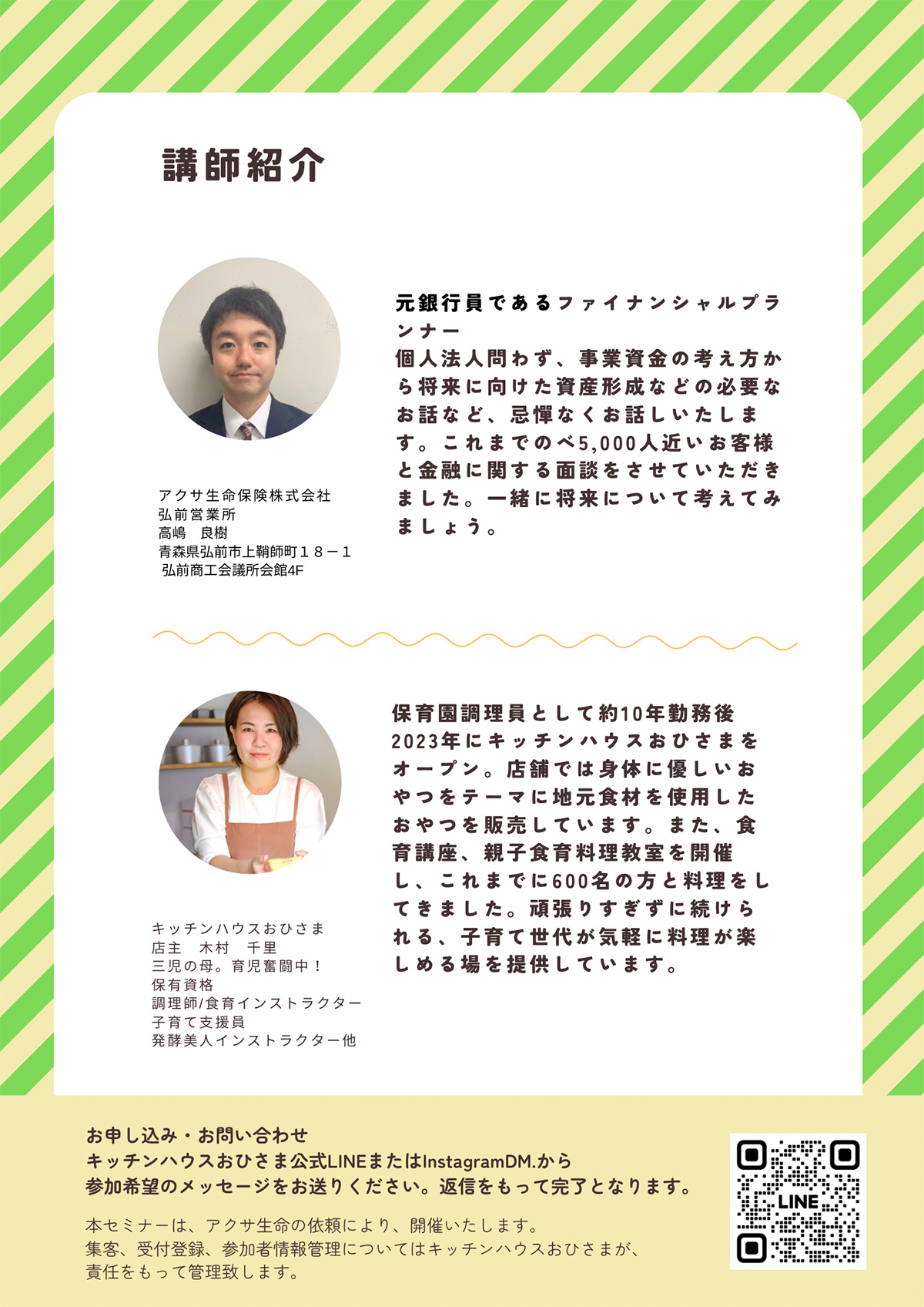 | 申込方法 | キッチンハウスおひさま公式LINEまたはInstagramDM.から参加希望のメッセージをお送りください。返信をもって完了となります。 |