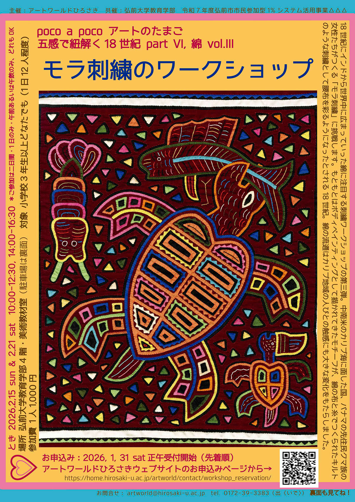 | その他 | 対象は小学3年生以上どなたでも。 参加のご予約は、1月31日正午から、アートワールドひろさきウェブサイトで受付開始となります(先着順)。 |