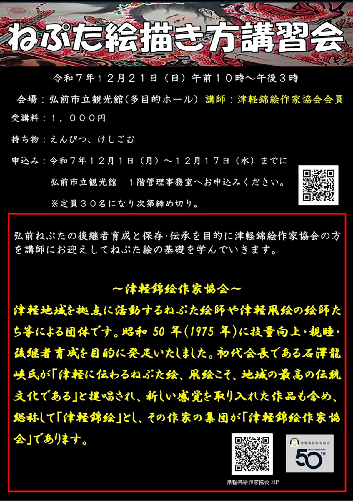 | その他 | ◎昼食 各自(休憩時間に持参したものを会場内で食べることもできます) ◎持参品 鉛筆、消しゴム(材料となる紙、墨、色、ロウ等は主催者が準備する) ◎展示 受講者が描いた作品(カラー写し)を弘前城雪燈籠まつり会場で展示予定 (雪燈籠まつりの状況により、変更もあります) |