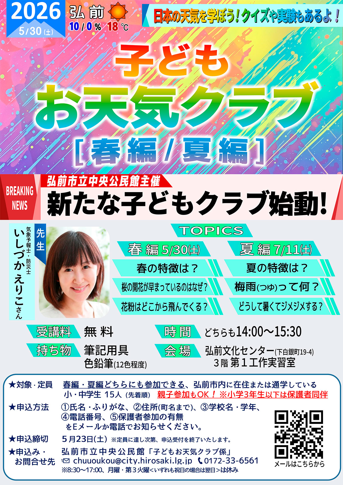 | 対象・定員 | 春編・夏編どちらにも参加できる、弘前市内に在住または通学している小・中学生 15人(先着順) ★親子参加も可。 ★小学3年生以下は保護者同伴。 |