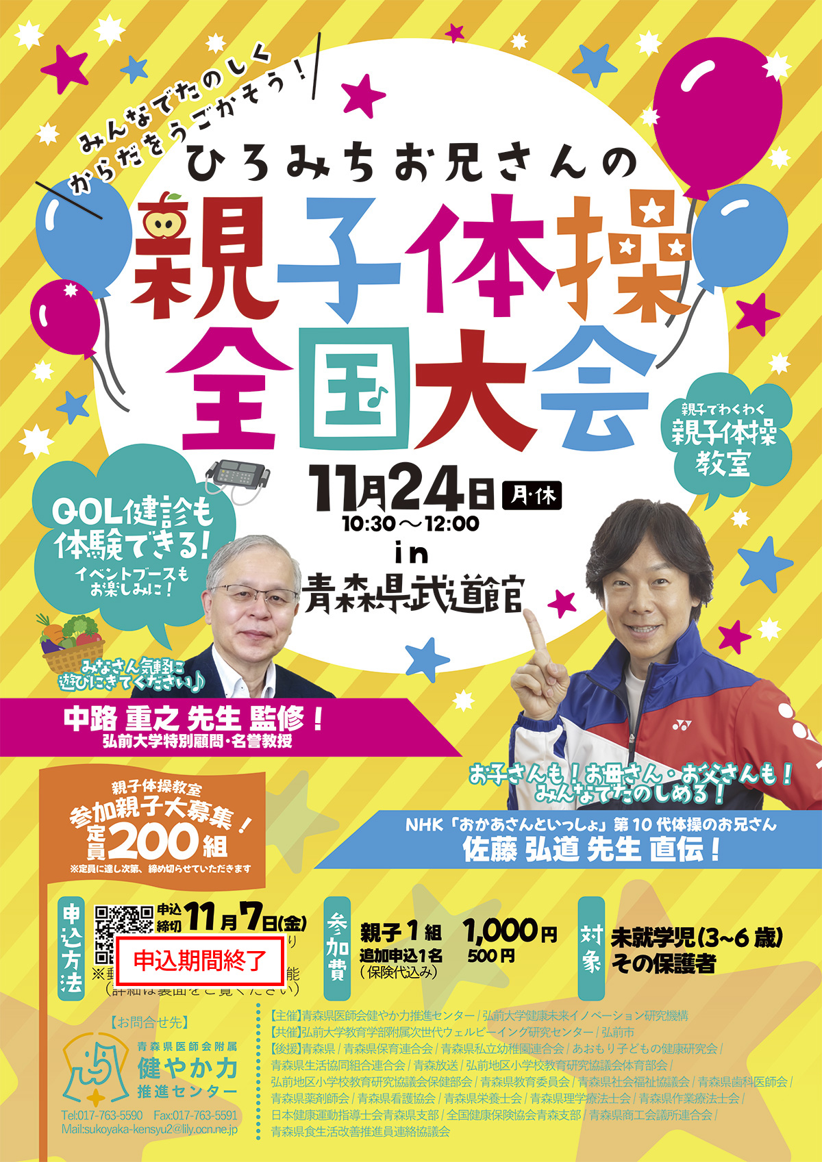 | 共催・お問い合わせ | 〇共催 弘前市健康こども部健康増進課 ☎ 0172-37-3750 〇お問い合わせ 健やか力推進センター ☎ 017-763-5590 |