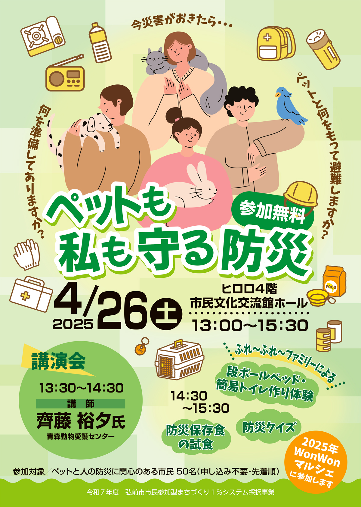 | 参加対象 | ペットと人の防災に関心のある市民 50名 (申し込み不要・先着順) |