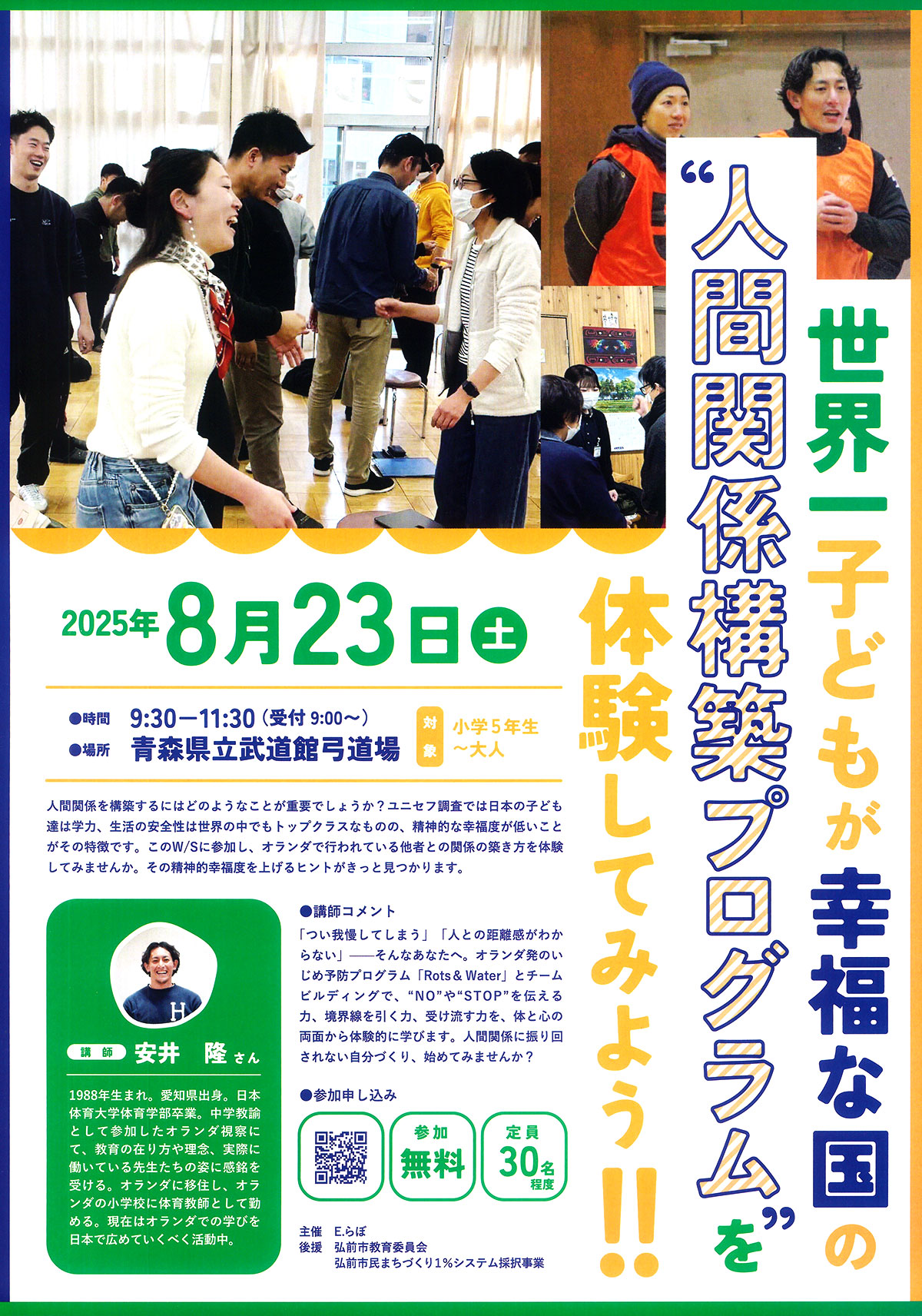 人間関係を構築するにはどのようなことが重要でしょうか?ユニセフ調査では日本の子ども達は学力、生活の安全性は世界の中でもトップクラスなものの、精神的な幸福度が低いことがその特徴です。このW/Sに参加し、オランダで行われている他者との関係の築き方を体験してみませんか。その精神的幸福度を上げるヒントがきっと見つかります。