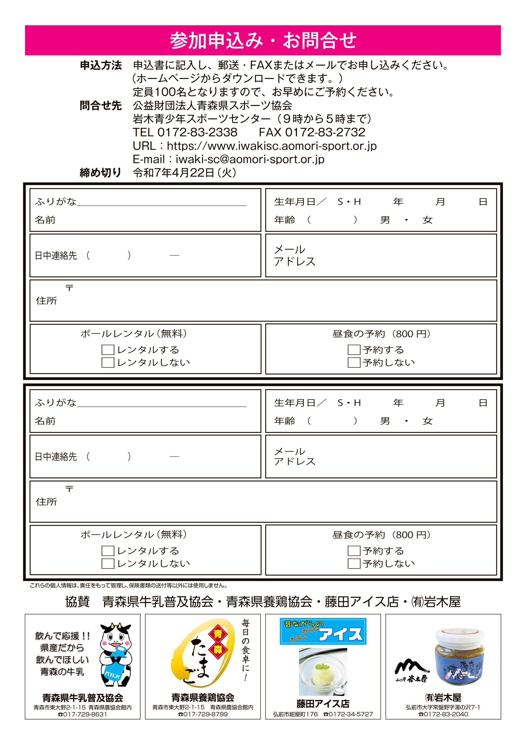 | お問い合わせ | 公益財団法人青森県スポーツ協会 岩木青少年スポーツセンター(9時から5時まで) TEL:0172-83-2338 FAX:0172-83-2732 URL:https://www.iwakisc.aomori-sport.or.jp E-mail:iwaki-sc@aomori-sport.or.jp |