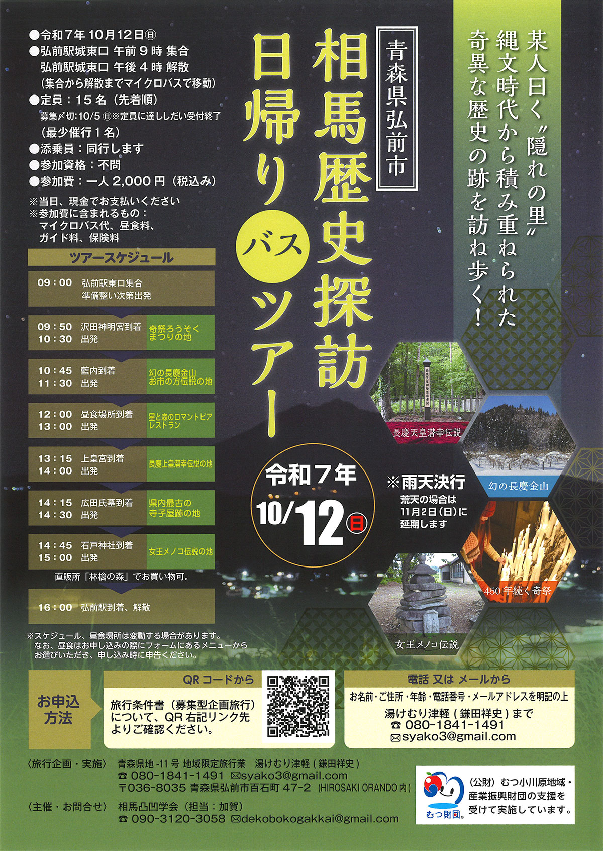 | 申込方法 | ・申込フォームから https://docs.google.com/forms/d/e/1FAIpQLSfj8aECQmfXOmCYKAIGTKHB2QG4eUOPW7kboiGoCj1wbfRj8A/viewform ・電話、メールから お名前・ご住所・年齢・電話番号・メールアドレスを明記の上 湯けむり津軽(鎌田祥史)まで 080-1841-1491 syako3@gmail.com |