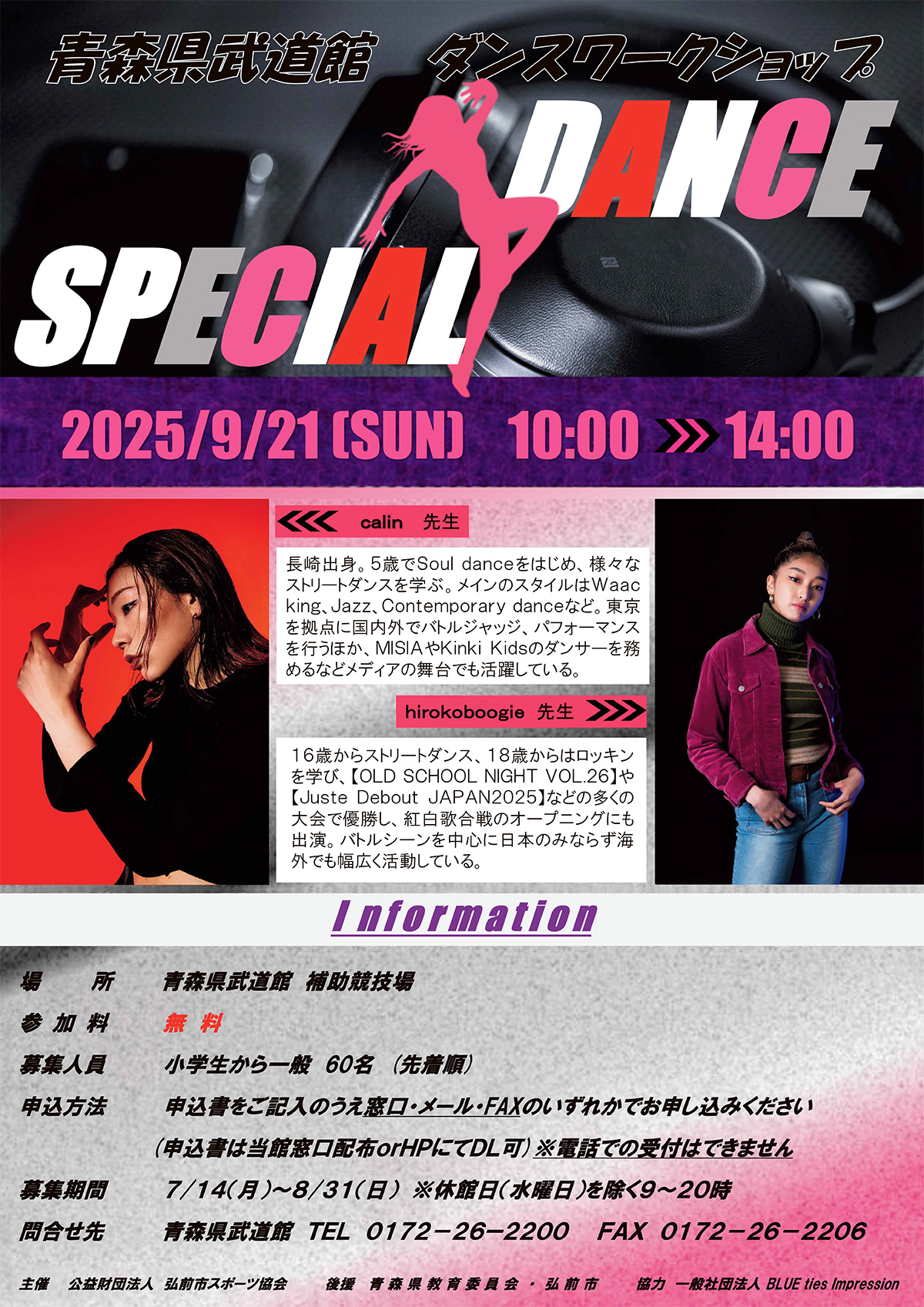| その他 | ・申込書は武道館ホームページからダウンロードできます ダウンロードページ https://www.aomorikenbudoukan.com/web/download.html 武道館窓口に提出、またはメール・FAX可 ・参加者は、必ず、運動できる服装・室内用運動靴・タオルをご持参ください。 |