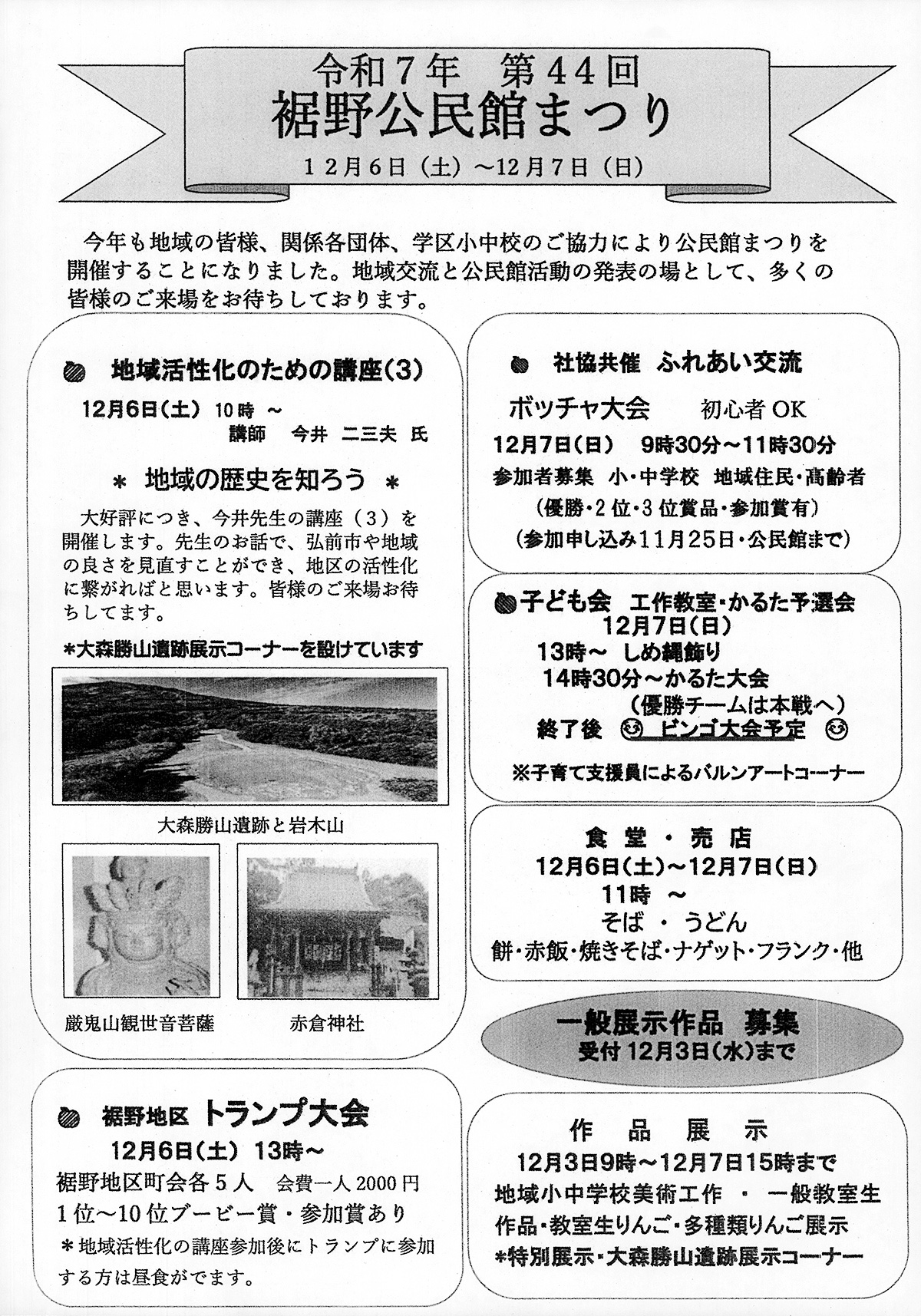 今年も地域の皆様、関係各団体、学区小中校のご協力により公民館まつりを開催することになりました。地域交流と公民館活動の発表の場として、多くの皆様のご来場をお待ちしております。