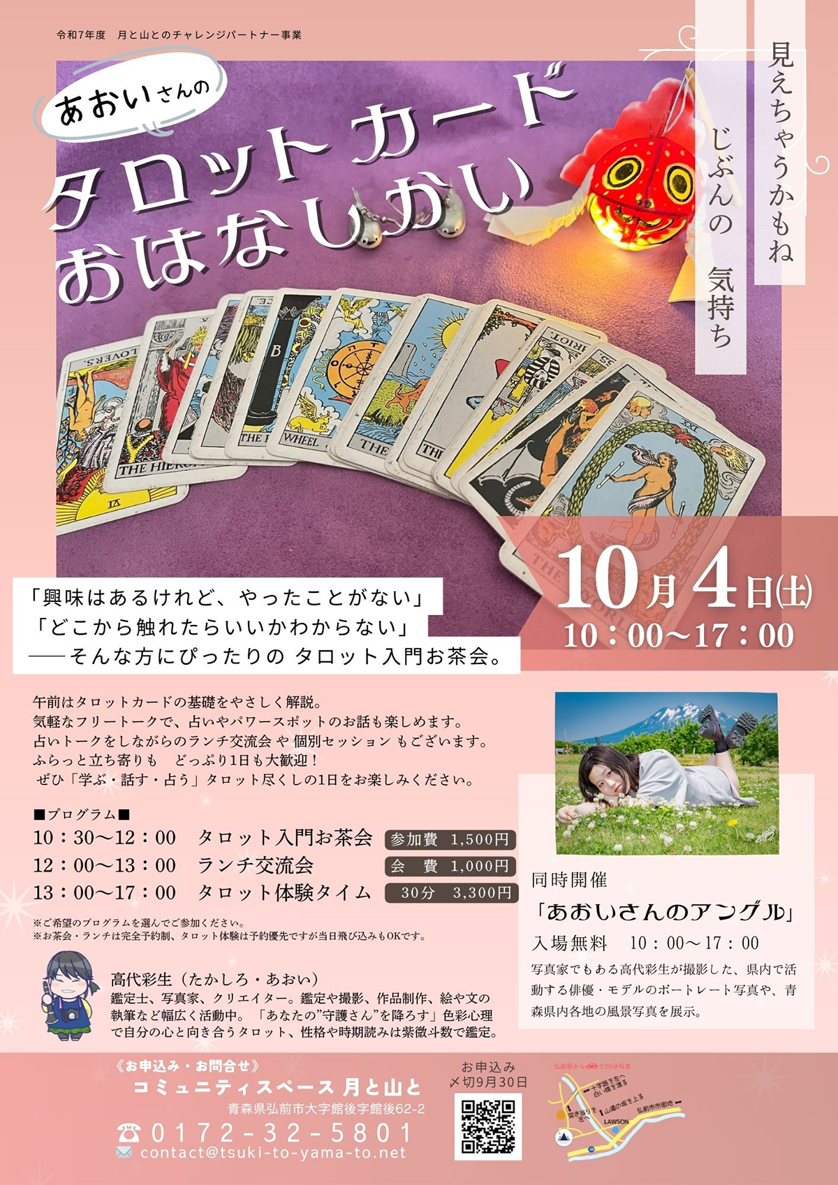 | 料金 | タロット入門お茶会 1500円 ランチ交流会 1000円 タロット体験タイム 30分 3300円 |