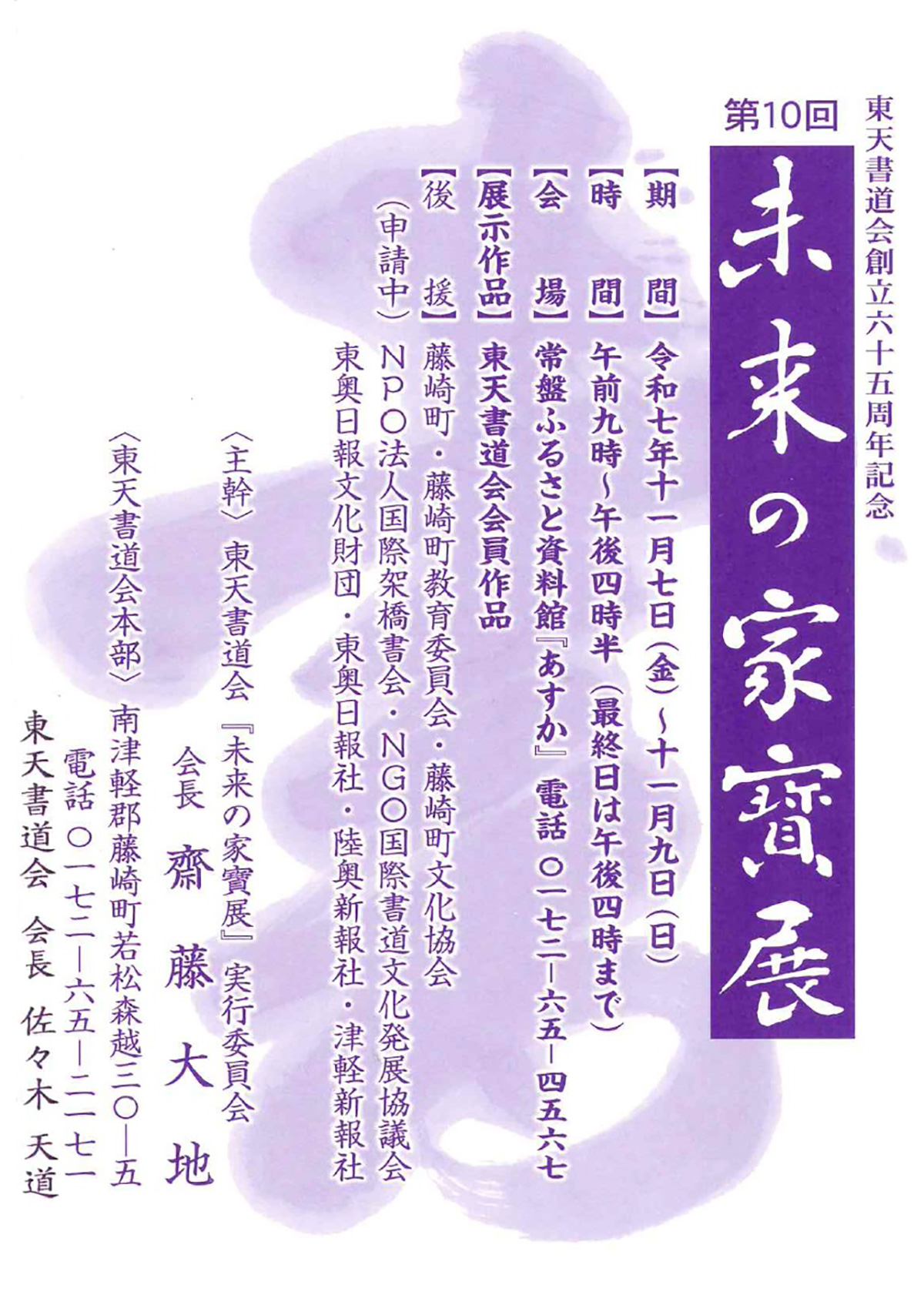当書道会の会員の作品を一堂に展示します。5年に一回の記念の展示ですので、多くの方にご覧いただきたいと思います。