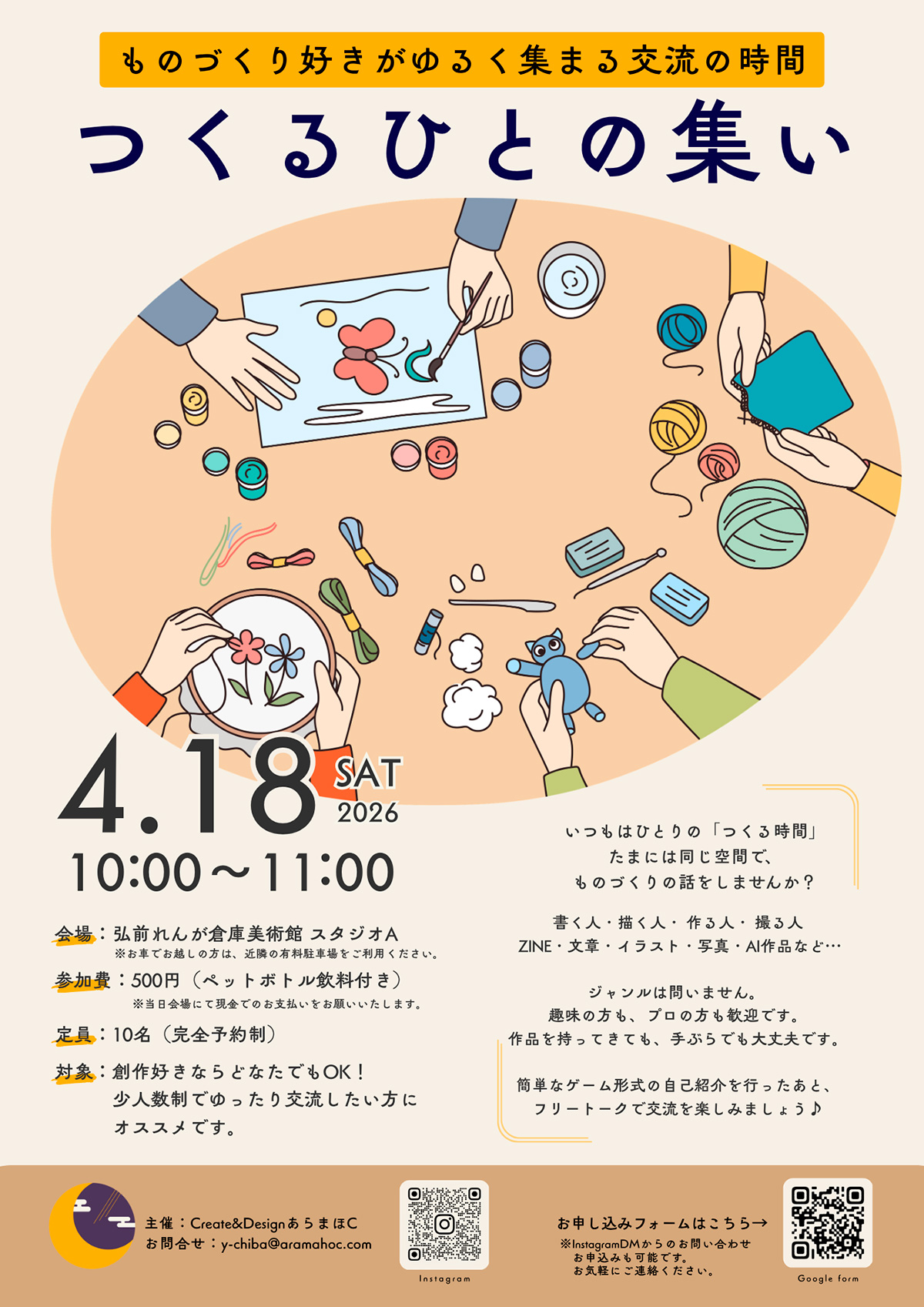 | 対象 | 創作好きならどなたでもOK! 少人数制でゆったり交流したい方にオススメです。 |