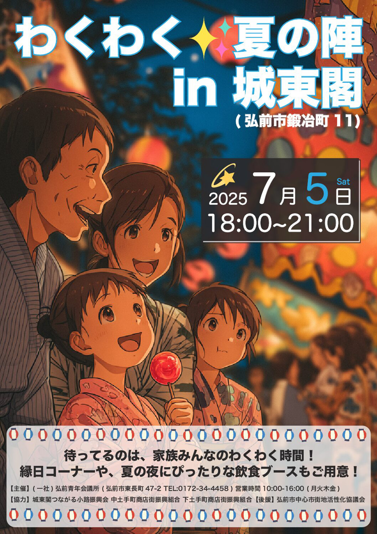 弘前市・城東閣をまるごと使ったスペシャルイベント《わくわく夏の陣》を開催します。・わなげや射的などの縁日ブース・飲食スペースあり(大人も楽しめる!)・幻想的な提灯の灯りの中、夜までわくわく…!お子さんはもちろん、大人も一緒に楽しめる“夏の思い出”になること間違いなしです。